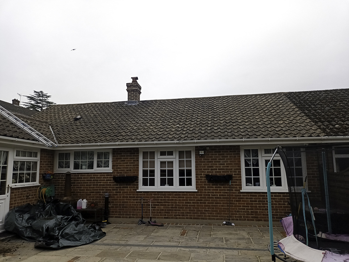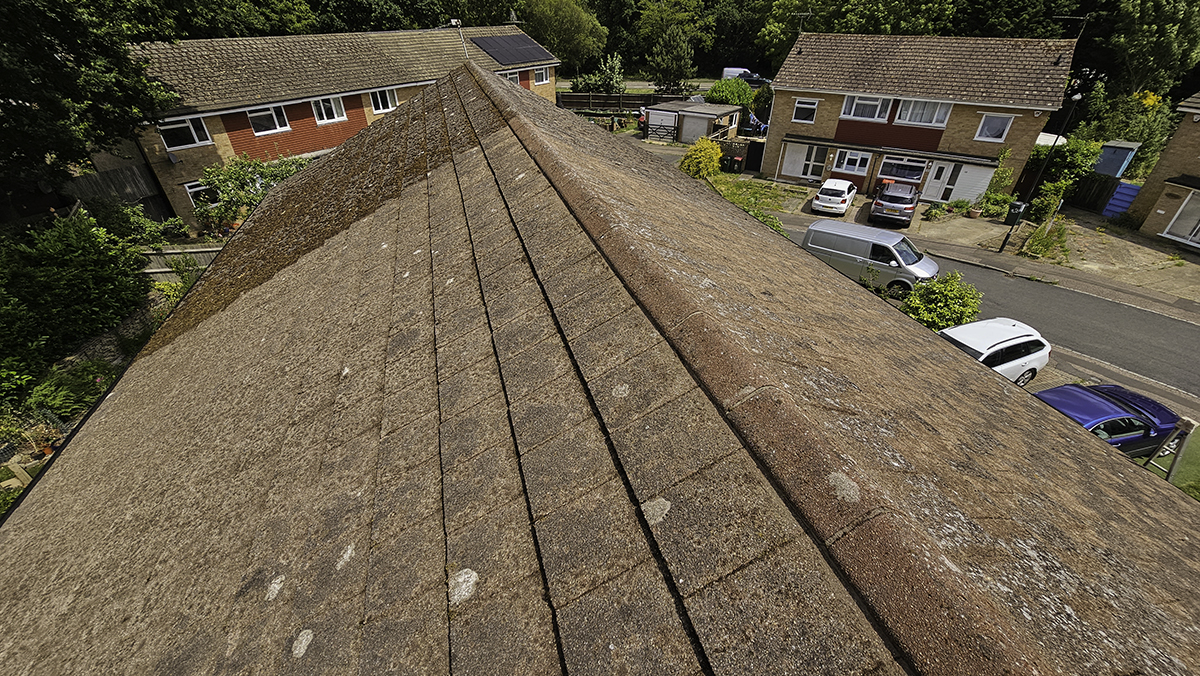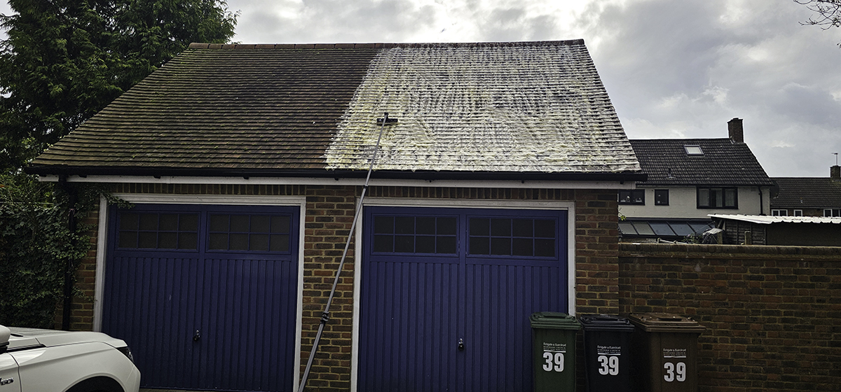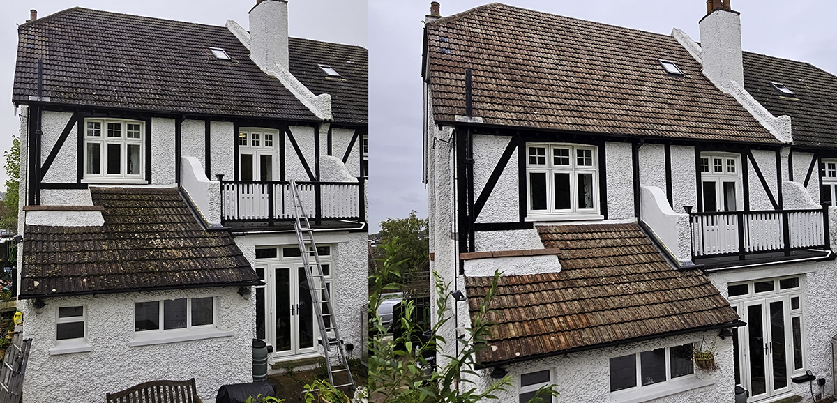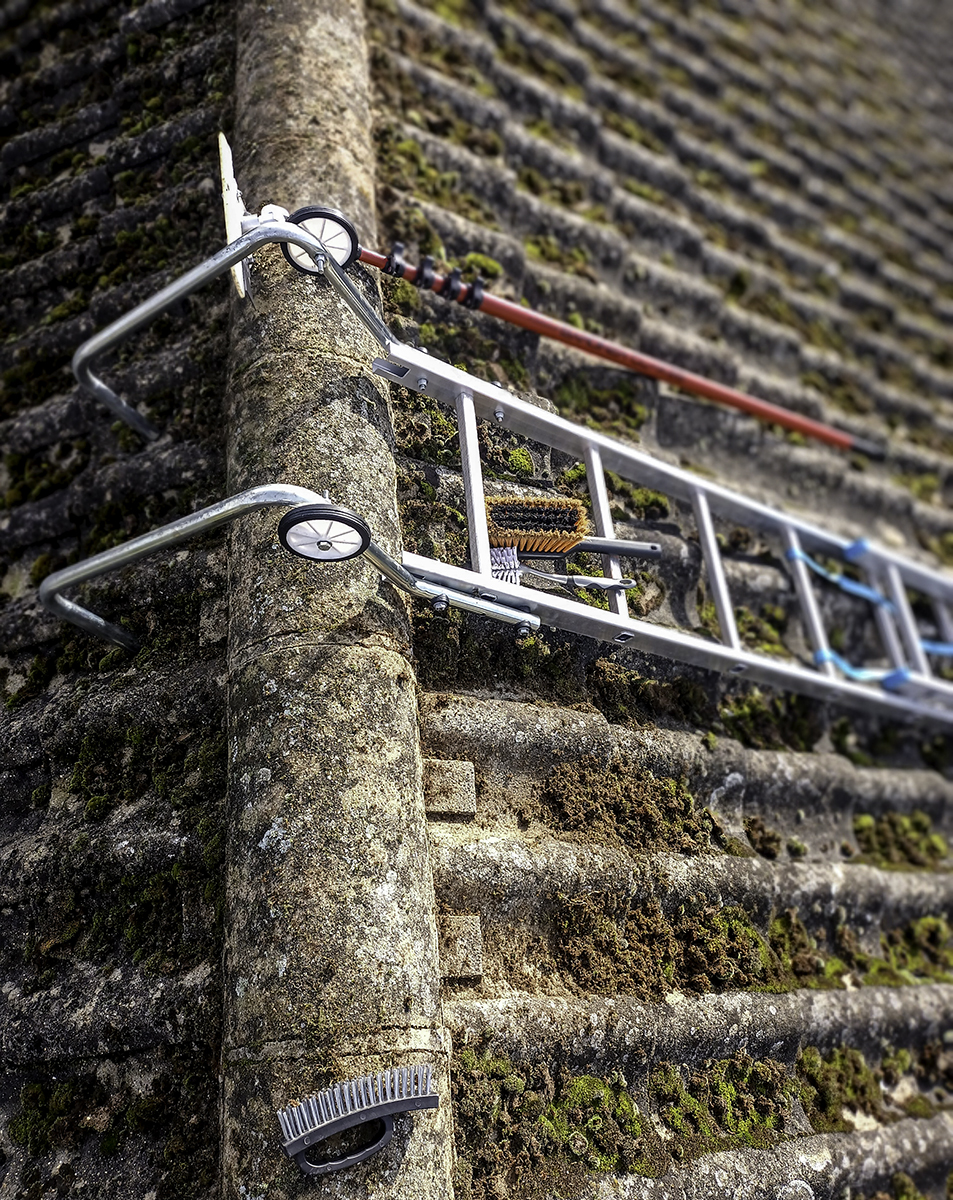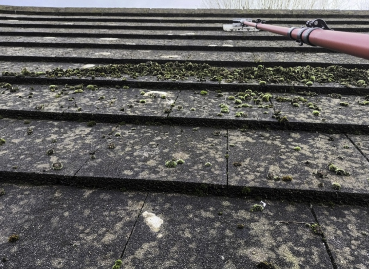 Our roof cleaning process removes moss safely and effectively without the need for scaffolding. Using telescopic poles, scrapers, and wire brushes, we clear moss from the tiles before fully clearing out gutters and applying a biocide treatment.